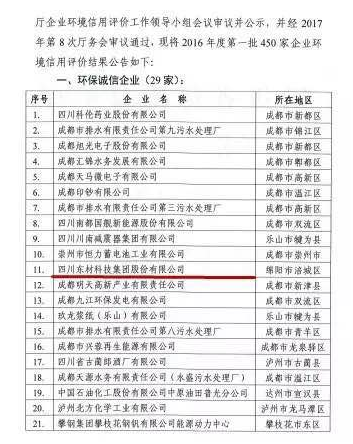 7月21日,四川省環(huán)境保護廳發(fā)布2017年第1號公告,公布了2016年度第一批企業(yè)環(huán)境信用評價結果。在全省申報的851家企業(yè)中,包括四川東材科技集團股份有限公司在內的29家企業(yè)獲得四川省2016年度“環(huán)境誠信企業(yè)”稱號。