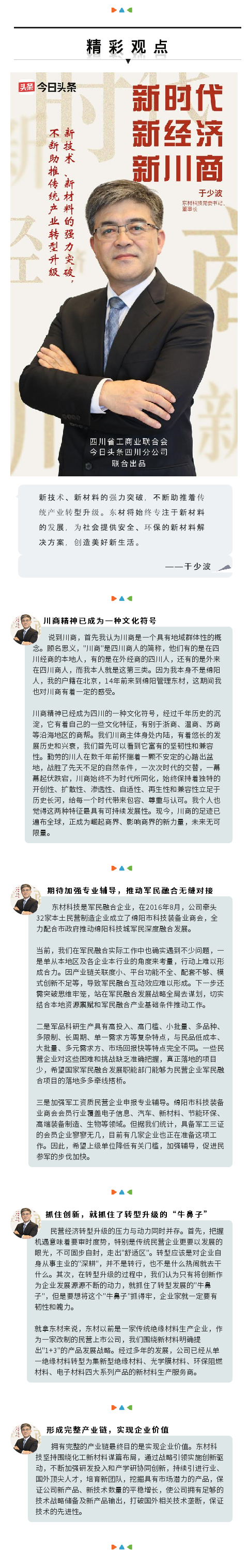 作為川內(nèi)新材料行業(yè)的排頭兵、國(guó)內(nèi)絕緣材料企業(yè)領(lǐng)軍企業(yè)的帶頭人,日前,四川東材科技集團(tuán)股份有限公司公司黨委書記、董事長(zhǎng)于少波作為新川商代表接受了《今日頭條》的專訪,分享了他對(duì)于新川商、軍民融合產(chǎn)業(yè)發(fā)展、民營(yíng)企業(yè)轉(zhuǎn)型升級(jí)的看法以及未來(lái)規(guī)劃等內(nèi)容。