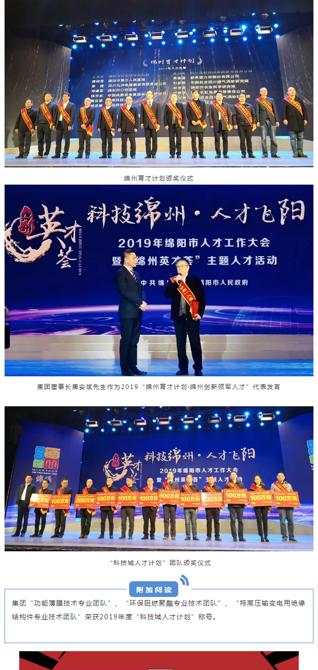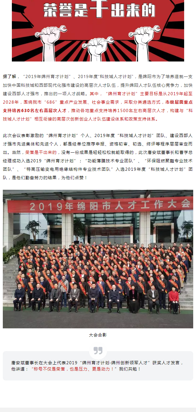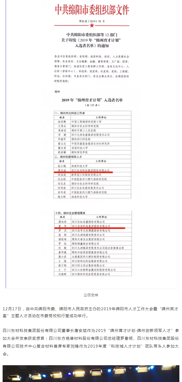 12月10日,綿陽市市委組織部等12部門聯(lián)合發(fā)布《關(guān)于印發(fā)2019年“綿州育才計(jì)劃”入選者名單的通知》(綿組通〔2019〕78號),公示了14類125名入選者名單,公司董事長唐安斌成功入選2019“綿州育才計(jì)劃·綿州創(chuàng)新領(lǐng)軍人才”, 總經(jīng)理曹學(xué)成功入選2019年“綿州育才計(jì)劃·綿州企業(yè)管理菁英”。